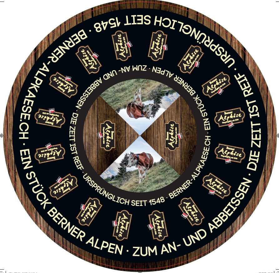 Laibetikette für Berner Alp- und Hobelkäse AOP. Mit Schmierwasser aufzulegen.